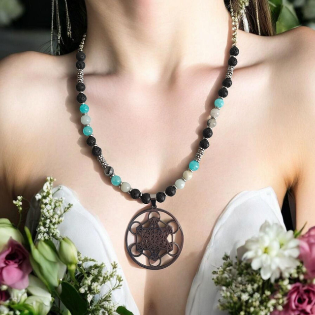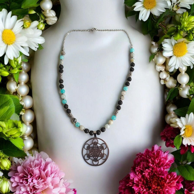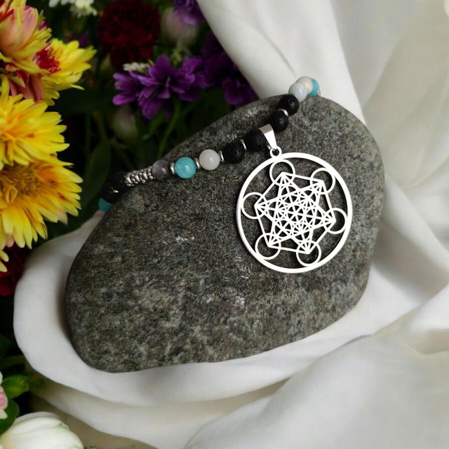 Découvrez notre nouvelle version du cube de Metatron, un chef-d'œuvre en acier inoxydable argenté, sublimé par des pierres naturelles d'Amazonite et des pierres de lave.