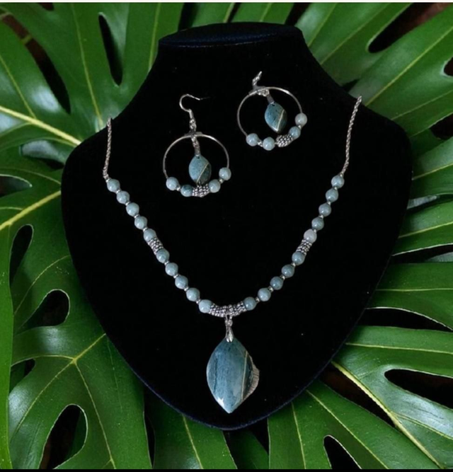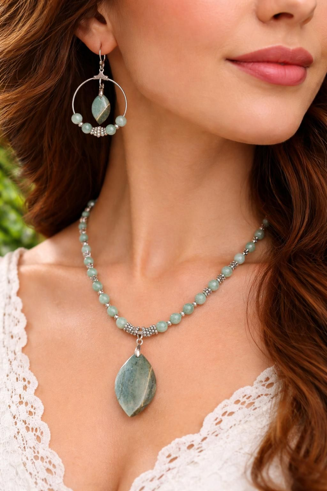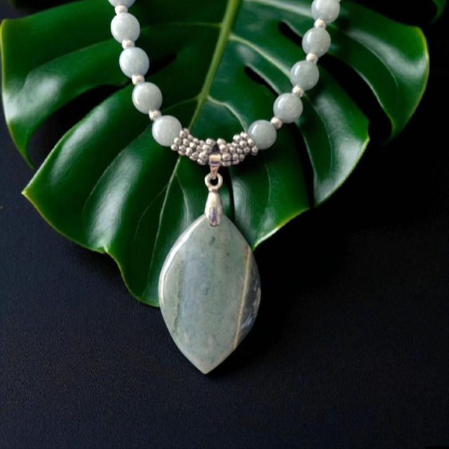 Cette parure se compose d’un collier délicatement orné de perles de jade de Birmanie, connues pour leurs vertus de paix intérieure, de sagesse et d’harmonie, accompagnées de magnifiques pierres de jaspe vert imprimé, pierre d’enracinement et de force.