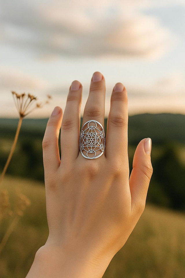 Laissez-vous envoûter par la bague Cube de Metatron, symbole sacré d’harmonie et de lumière.