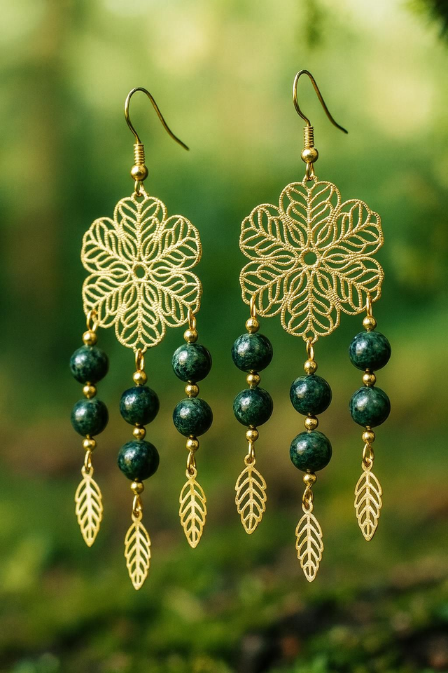 Le jaspe Kambaba, pierre ancienne aux reflets verts mystérieux, s’unit à la finesse du doré pour créer un bijou à la fois délicat, spirituel et profondément féminin.