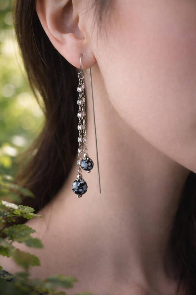 Fines et aériennes, ces boucles d’oreilles en obsidienne flocon de neige dansent délicatement au gré des mouvements.
