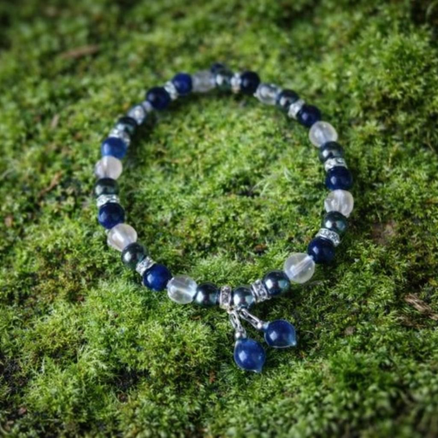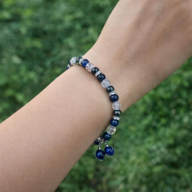 L’Œil de tigre bleu veille avec douceur, l’Hématite ancre et protège, tandis que le Cristal de roche éclaire et amplifie chaque intention.