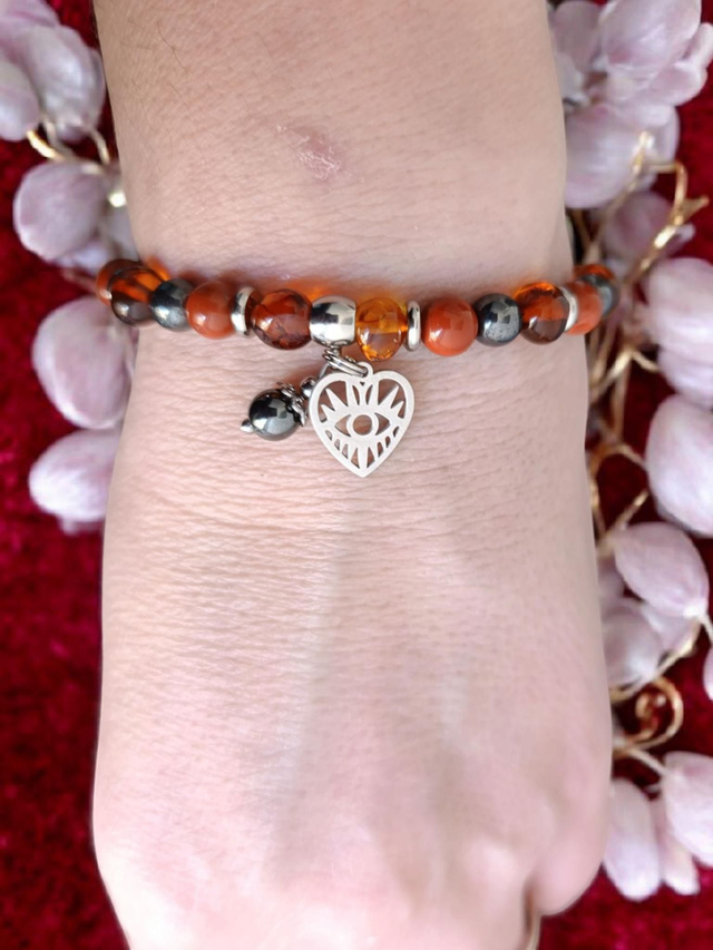 Découvrez ce magnifique bracelet en ambre, jaspe rouge et hématite, une alliance de pierres naturelles choisies pour leur énergie de confort, de soutien et de vitalité.