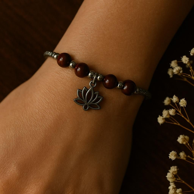 Découvrez ce magnifique bracelet coulissant en pierre naturelle d'œil de taureau, orné d'une délicate breloque fleur de lotus.