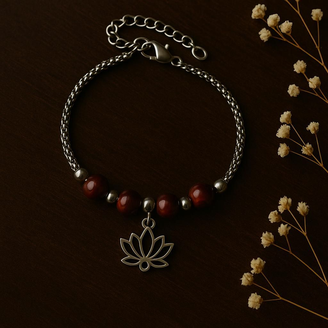 La pierre d'œil de taureau est réputée pour ses propriétés protectrices et équilibrantes, tandis que la fleur de lotus symbolise la pureté et la renaissance.