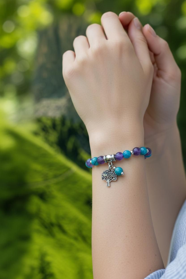 Ce bracelet en pierres naturelles associe l’énergie douce de l’améthyste à la vitalité inspirante de l’apatite.