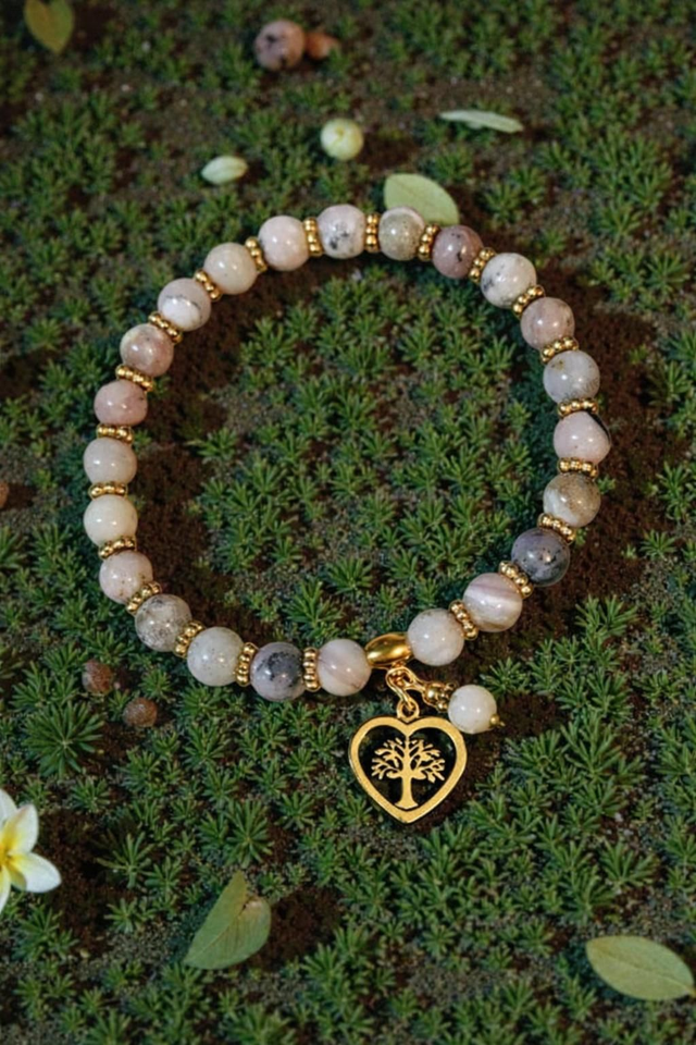 La douceur de l’Opale Rose s’invite dans ce bracelet poétique orné d’un cœur Arbre de Vie