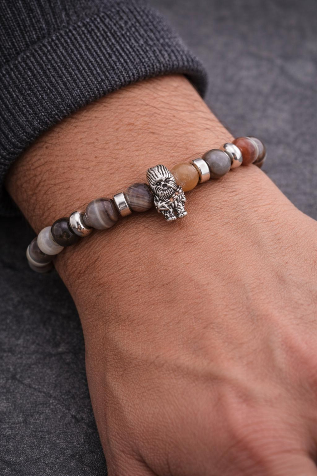 Découvrez ce bracelet en Agate Botswana aux nuances naturelles et apaisantes, accompagné d’un petit charm en argent inspiré d’un Wookiee.