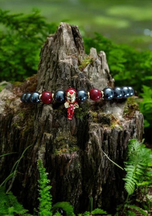 Découvrez le bracelet Pandolith mixte, un accessoire élégant alliant des pierres naturelles de cinabre et d'hématite, parfait pour les admirateurs d'Iron Man.