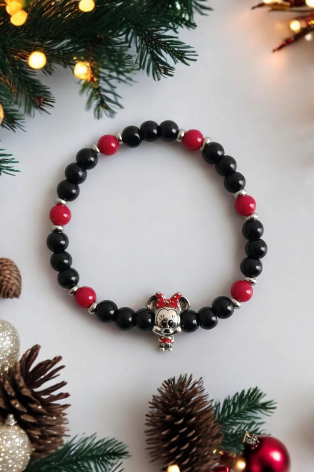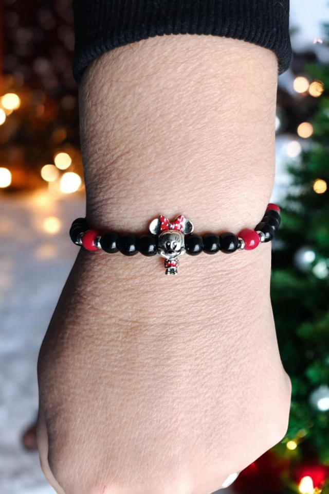 Fabriqué en pierres naturelles d'onyx et d'agate rouge, il est orné d'un charm en argent 925 représentant une célèbre petite souris de notre enfance.