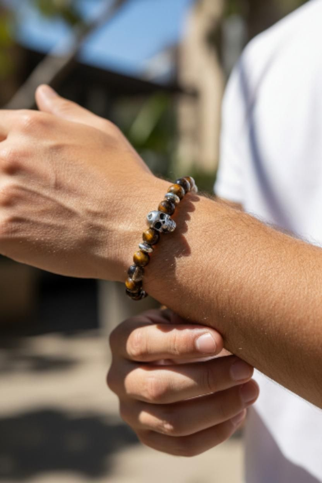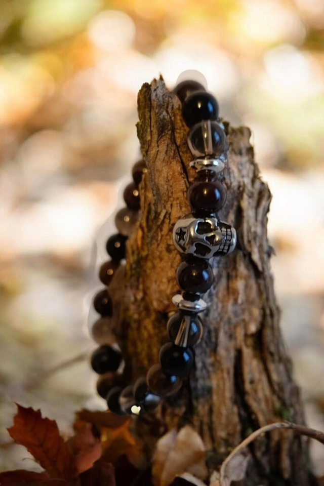 Confectionné avec des pierres naturelles telles que l'œil de tigre, le quartz fumé et l'obsidienne, il se distingue par sa tête de mort en acier inoxydable, ajoutant une touche audacieuse à votre style.