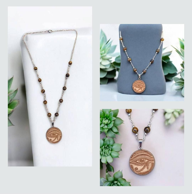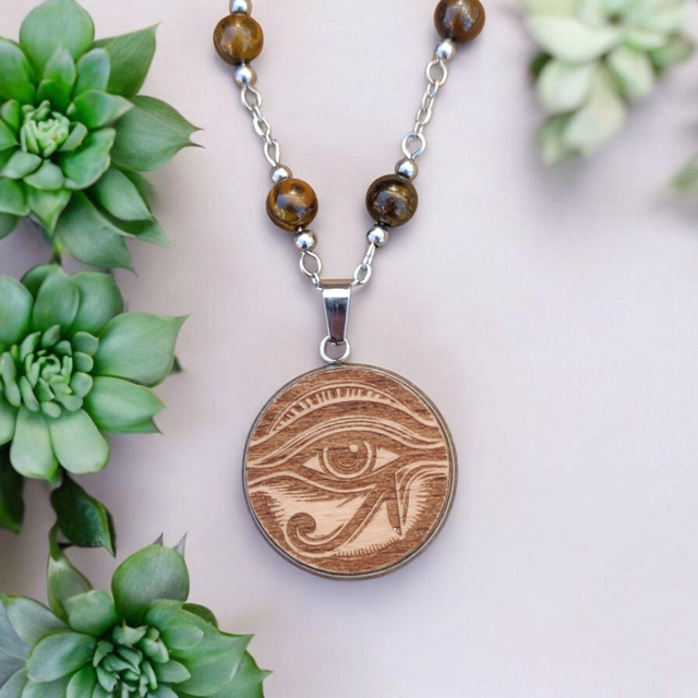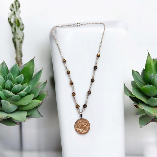 Découvrez ce superbe collier en œil de tigre, orné d'un pendentif œil d'Horus, conçu en collaboration avec maîleen créations.
