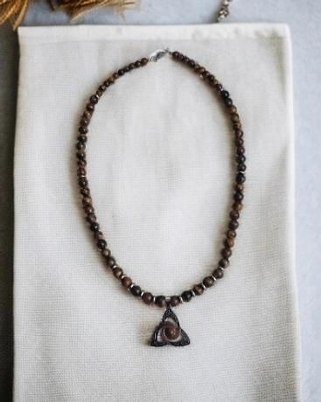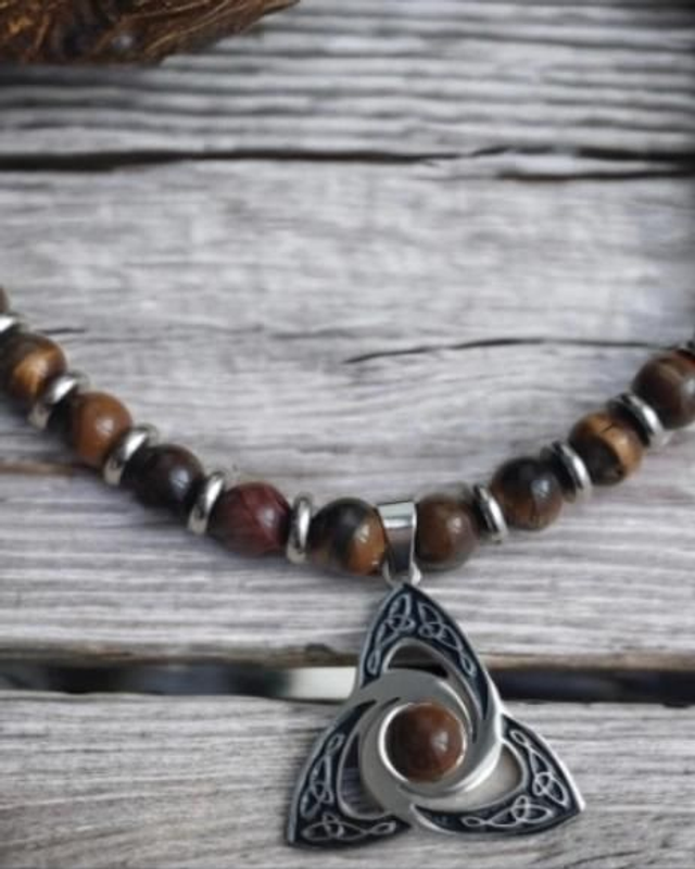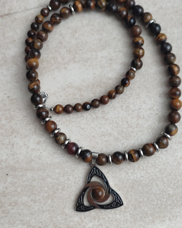 Ce collier pour homme se distingue par son pendentif en Triquetra, symbole puissant d'harmonie et d'équilibre. Fabriqué avec des pierres naturelles d'œil de tigre, il allie esthétique et bienfaits spirituels, offrant protection et clarté d'esprit.