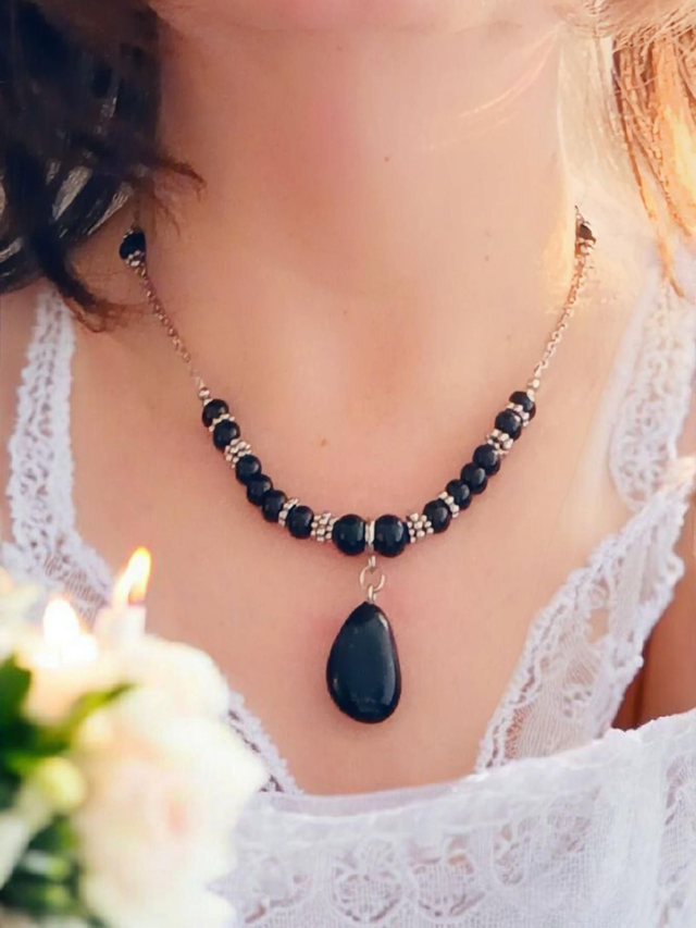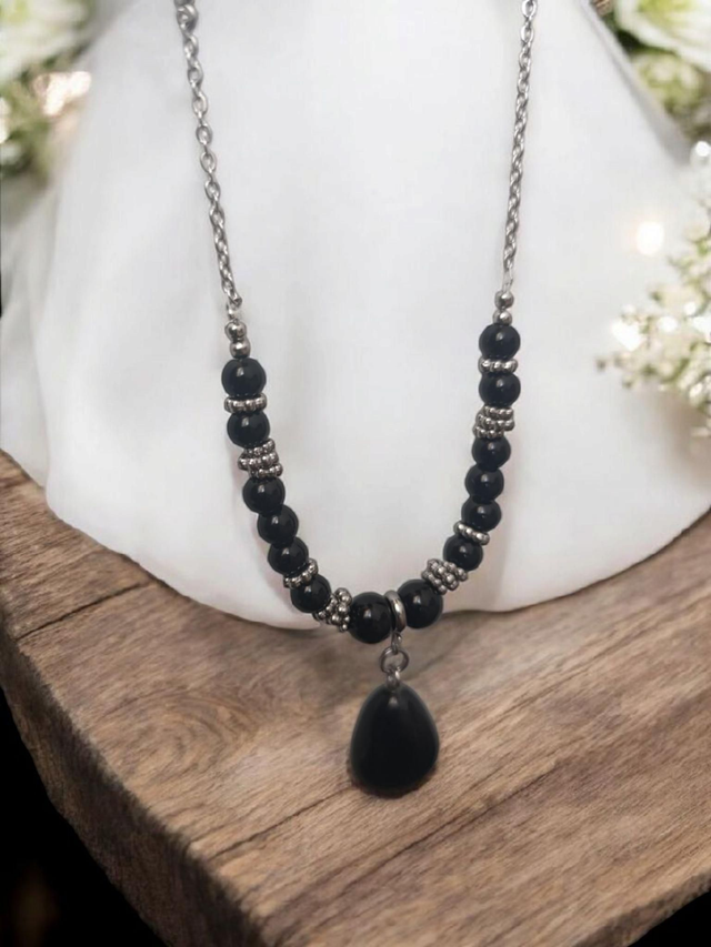 Laissez-vous envoûter par la profondeur mystérieuse de ce collier en Onyx, accompagné de son pendentif entièrement sculpté dans la pierre. Chaque perle, sombre et satinée, semble retenir un fragment de nuit, tandis que le pendentif diffuse une énergie plus brute, plus intuitive, comme si la pierre parlait directement à l’âme.