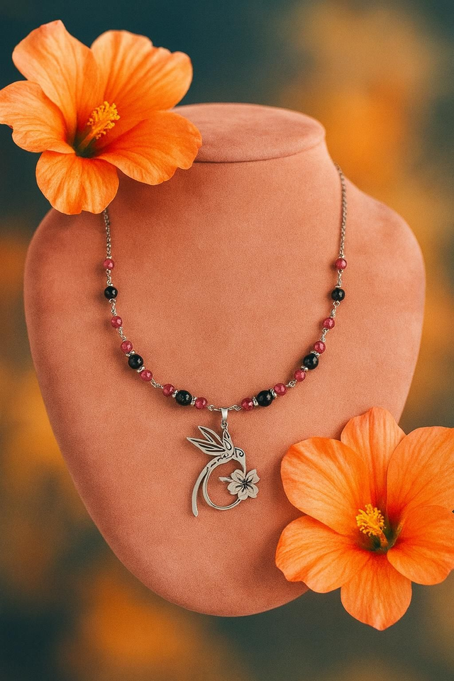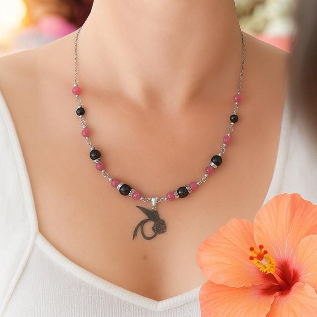Découvrez notre magnifique collier en pierres naturelles de Tourmaline melon d'eau et tourmaline noire, accompagné d'un magnifique petit colibri en acier inoxydable.