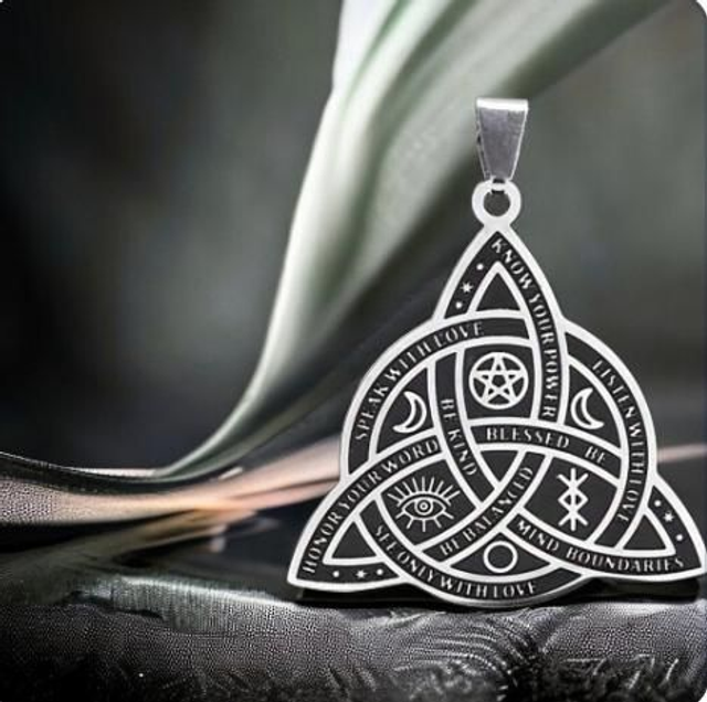 Ce bijou exceptionnel présente le symbole puissant de la Triquetra et associé aux vertus des pierres naturelles des 3 Oeils , représentant les trois interconnexions de la vie, la mort et la renaissance, dans le contexte de la mythologie nordique et pour apporter une protection.