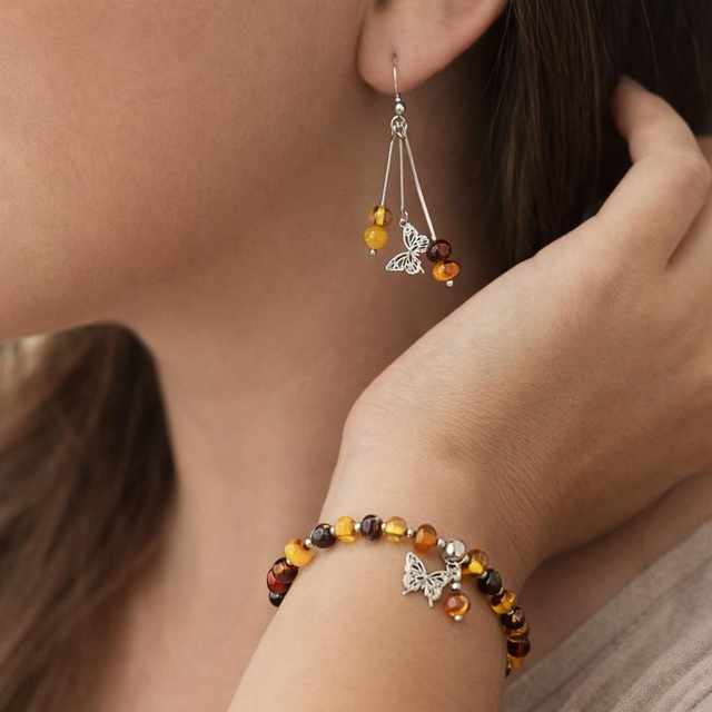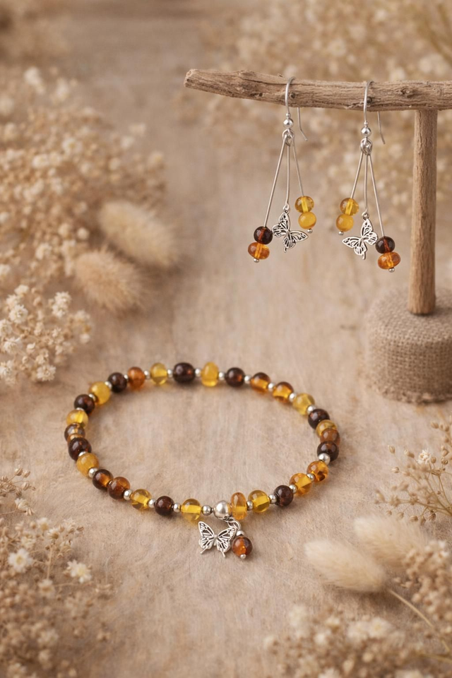 Comme une goutte de lumière figée par le temps, l’ambre baltique dévoile ici ses reflets dorés et chaleureux dans une parure délicate et harmonieuse. Bracelet et boucles d’oreilles s’unissent pour créer un ensemble lumineux, à la fois doux, naturel et profondément élégant.