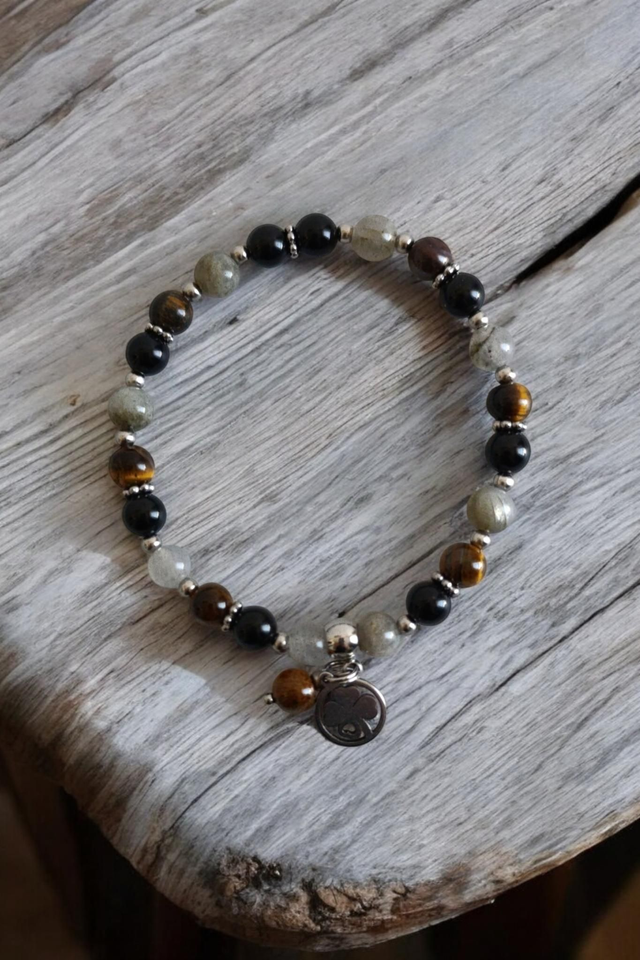 Cette box comprend un bracelet en pierres naturelles, de l'encens, de lae sauge, du sel rose, des pierres roulées et une fleur de vie....,