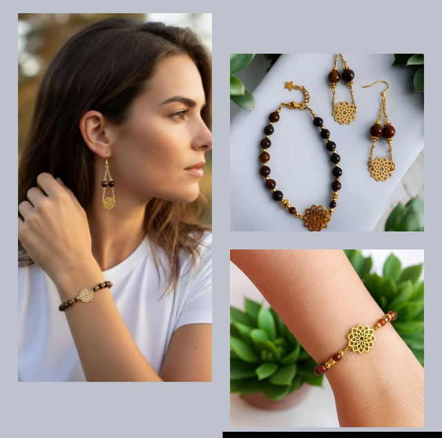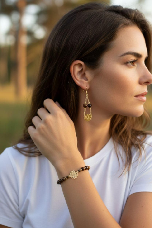 Laissez-vous envelopper par la magie de cette parure, où l’Œil de Taureau rencontre la Fleur de Vie dans une danse d’énergie et d’élégance.