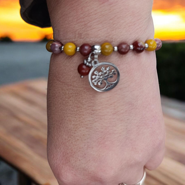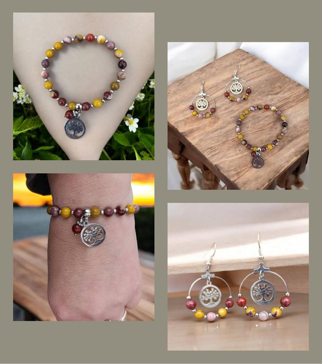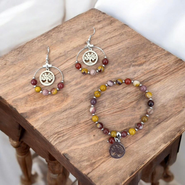 Ajoutez une touche d'élégance à votre look avec cette magnifique parure, comprenant une paire de créoles et un bracelet en jaspe Mokaite.