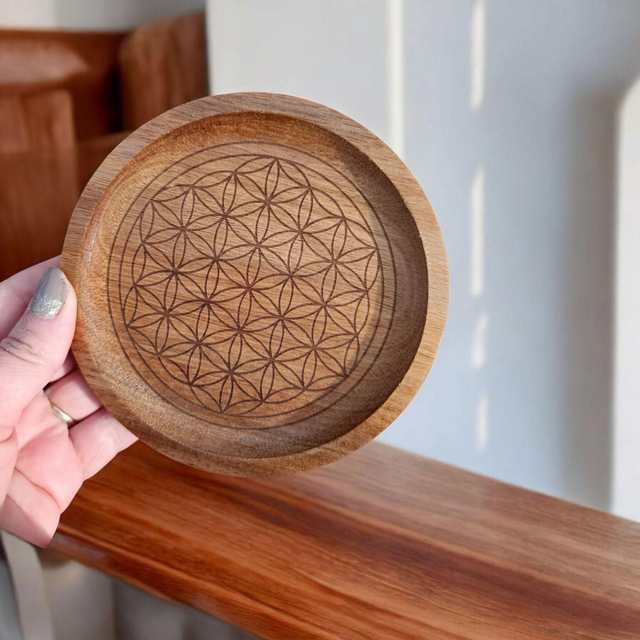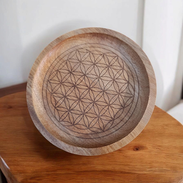 Apportez une touche d'élégance à votre espace avec cette plaque de rechargement fleur de vie en bois exotique de 13 cm, conçue par maîleen créations.